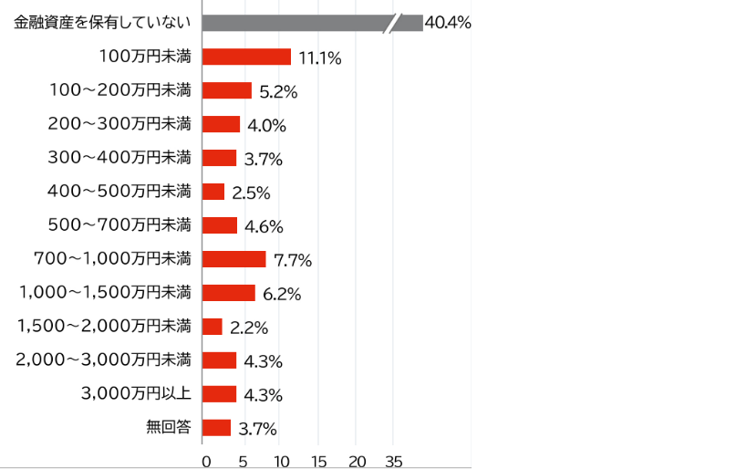 金融広報中央委員会が発表している「家計の金融行動に関する世論調査[単身世帯調査] 令和5年調査結果」によると、40代単身世帯の投資信託や債券、株式等を含めた金融資産の分布は以下のとおりです。
